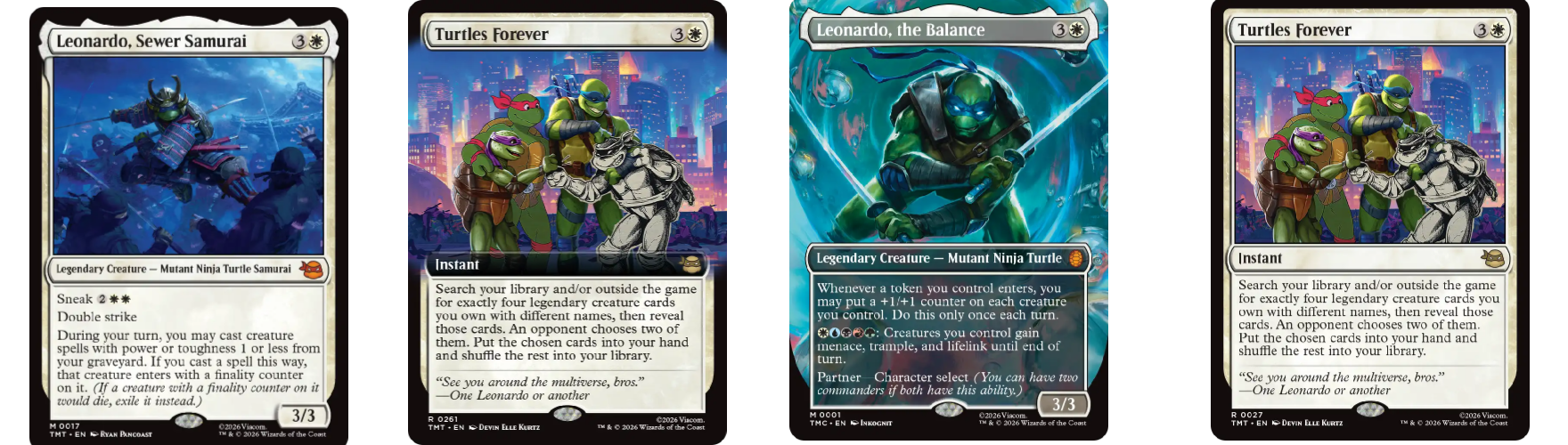 Leonardo, Sewer Samurai, and Turtles Forever can be found in Play Boosters, Collector Boosters, Turtle Team up, Bundles, Prerelease Packs, Commander Decks, Pizza Bundles, and at Draft Night events, while Leonardo, the Balanced, and Turtles Forever also appear across all formats.