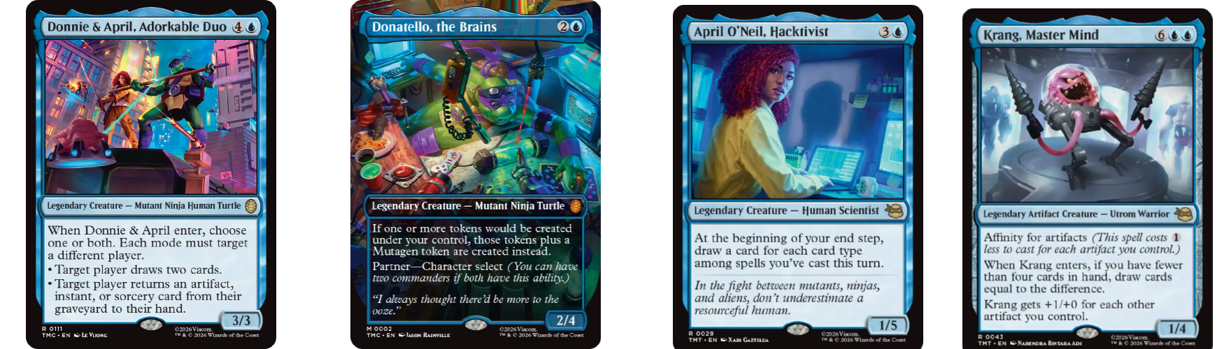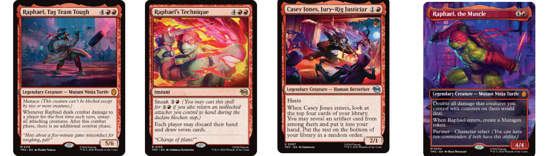 Multicolor cards bring the team together. Whether it's full-Turtle synergy, dual-color villains, or tag-team moments from allies like Casey Jones and April O'Neil, these cards reflect the full breadth of Turtle teamwork.