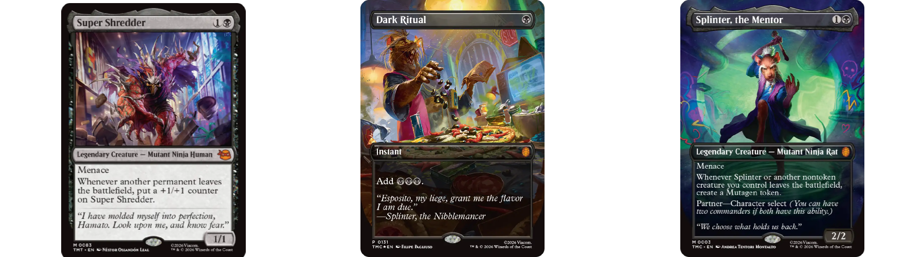 The shadows of the city are where black cards thrive. With themes of mutation, stealth, and villainy, black highlights characters like Shredder, Karai, and rogue ninjas in the Foot Clan.
