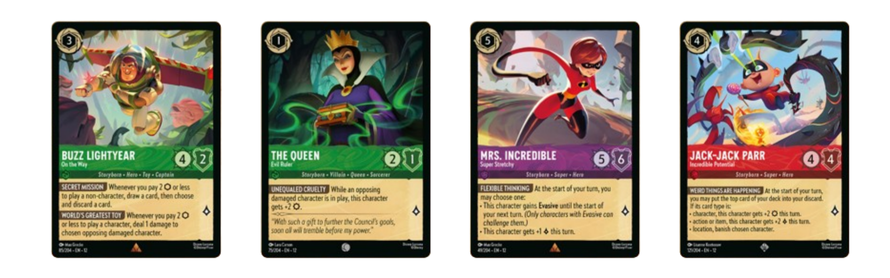 Mrs. Incredible serves as the face card for one of the Wilds Unknown starter decks, while the second starter deck pairs the unexpected duo of Buzz Lightyear and The Evil Queen.