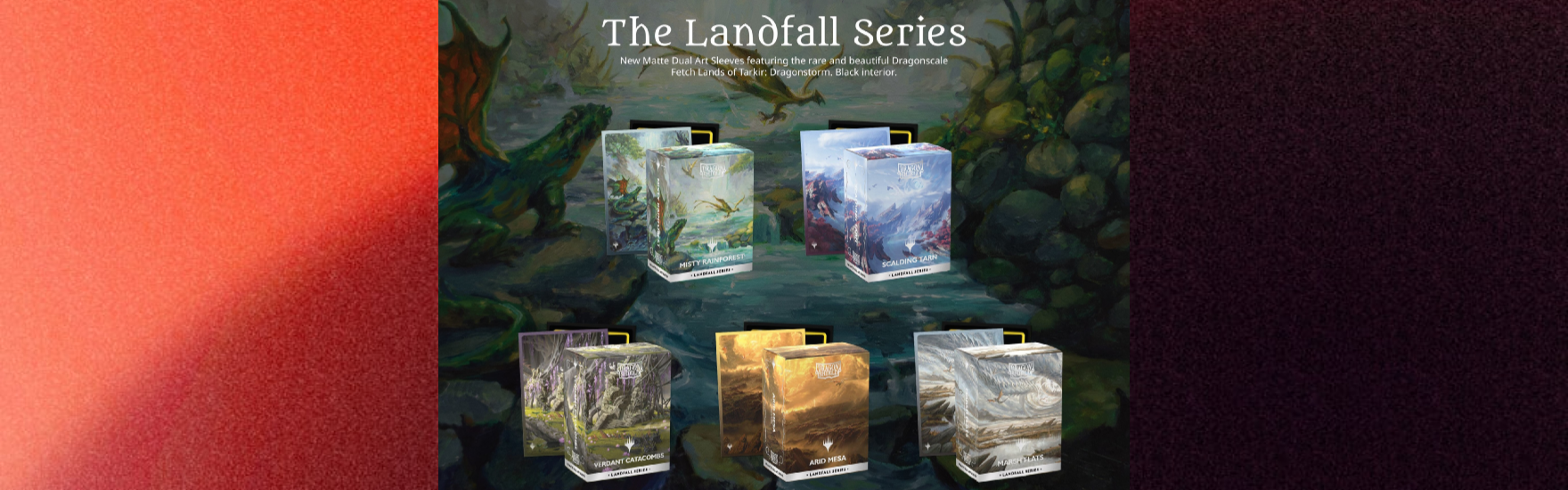 Celebrating the lands that define Magic’s multiverse, the Landfall Series begins with five showcase-style sleeves featuring the fetchlands from Tarkir: Dragonstorm’s Special Guest variant set. These lands—beloved for both gameplay impact and visual splendor—are illustrated by celebrated artists like Livia Prima and will be rendered in Dragon Shield’s signature high-quality art sleeve design.