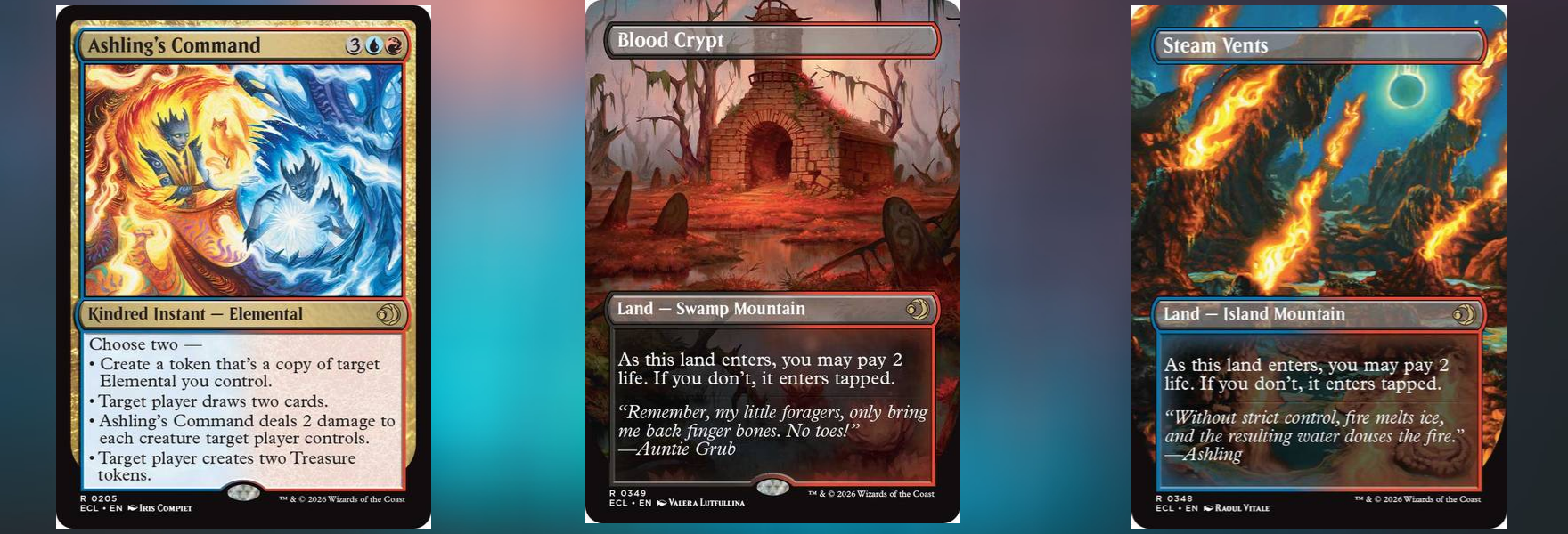 The set includes a reprint of shock lands—dual lands that are staples in both Commander and competitive formats. These lands are available in borderless reversible versions that showcase both Lorwyn and Shadowmoor artwork, with foil and non-foil options.