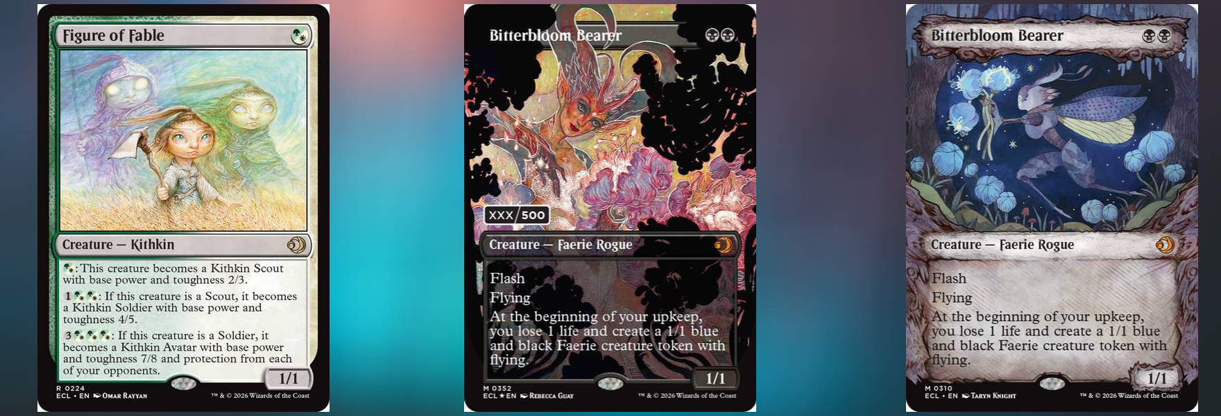 Fable frame cards — a new aesthetic twist that channels the fairy tale vibe of the set, available across 10 uncommons, 26 rares, and 14 mythic rares in booster packs