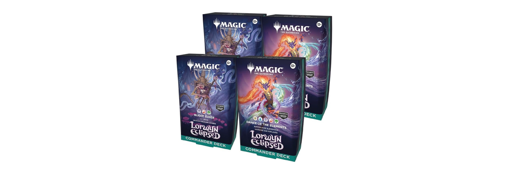 Magic: The Gathering The Lorwyn Eclipsed Commander Deck Carton (4) includes four ready-to-play 100-card decks designed for multiplayer Commander games, each highlighting the contrasting themes of light and shadow found in the Lorwyn and Shadowmoor planes. These decks feature new legendary commanders and tribal synergies focusing on mechanics like -1/-1 counters and elemental creatures, offering diverse strategic options.