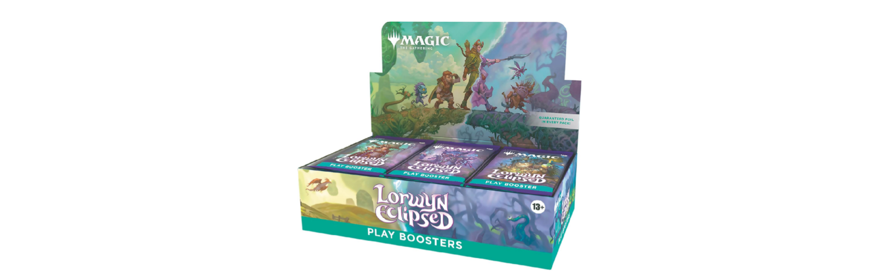 Magic: The Gathering Lorwyn Eclipsed Play Booster Display contains 30 individual play booster packs, each with 14 cards designed for limited-format play such as drafting and sealed deck experiences. Every booster includes a mix of 6-7 commons, 3 uncommons, 1 rare or mythic rare, 1 wildcard of any rarity, a guaranteed foil card, a basic land card, and a non-foil double-sided token. These boosters are perfectly balanced to offer both exciting gameplay and collectible opportunities, showcasing the dual themes of light and shadow from the Lorwyn and Shadowmoor planes.