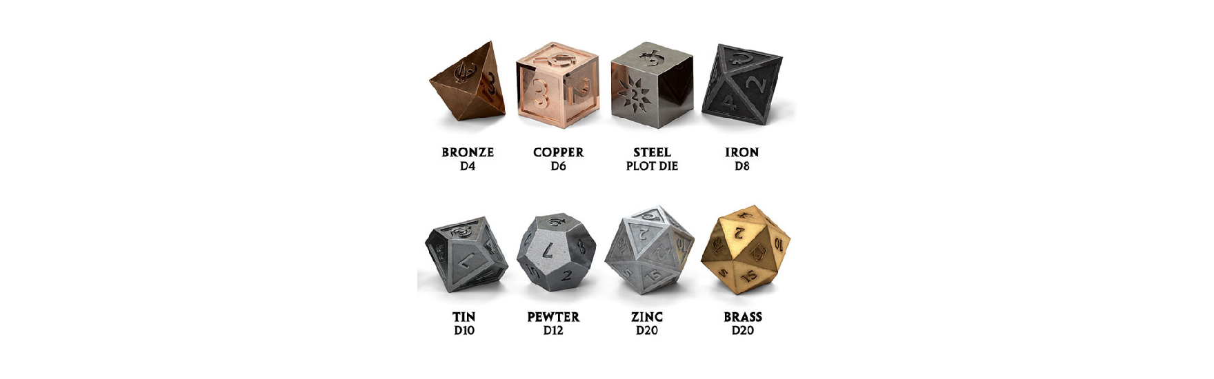Enhance your experience with the Mistborn Deluxe Dice Set. Each die features custom engravings with the highest face replaced by iconic metal symbols (steel, iron, tin, pewter, zinc, brass, bronze, copper), perfect for tracking burns and flares at the table.