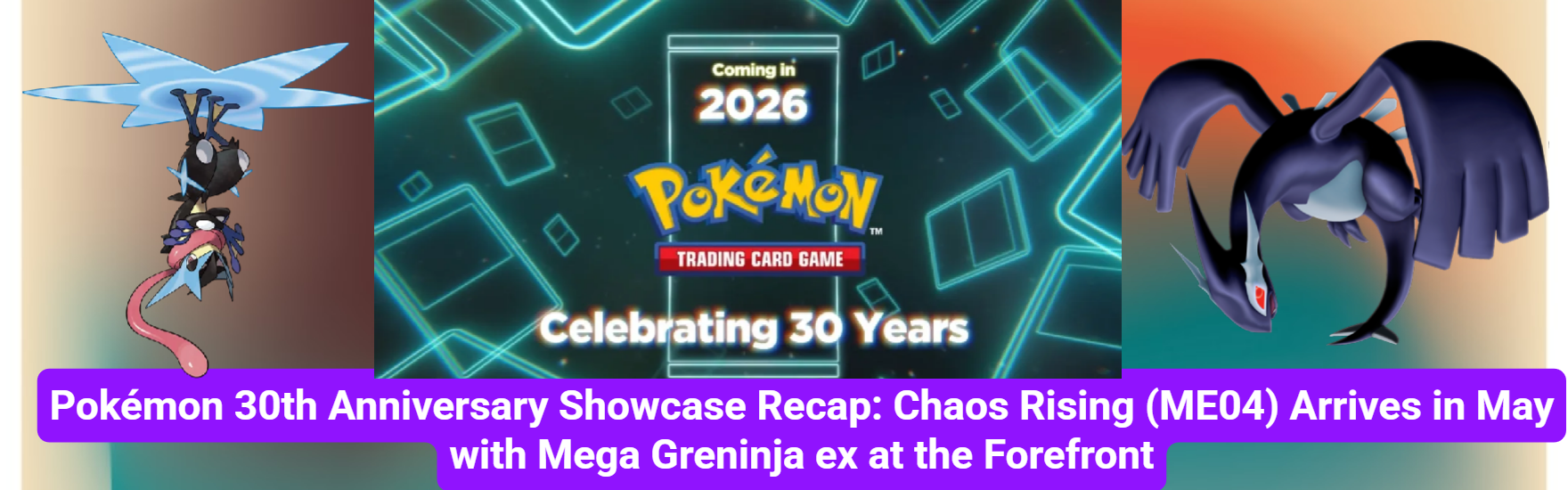 Pokemon 30th Anniversary Showcase Recap: Chaos Rising (ME04) Arrives in May with Mega Greninja ex at the Forefront