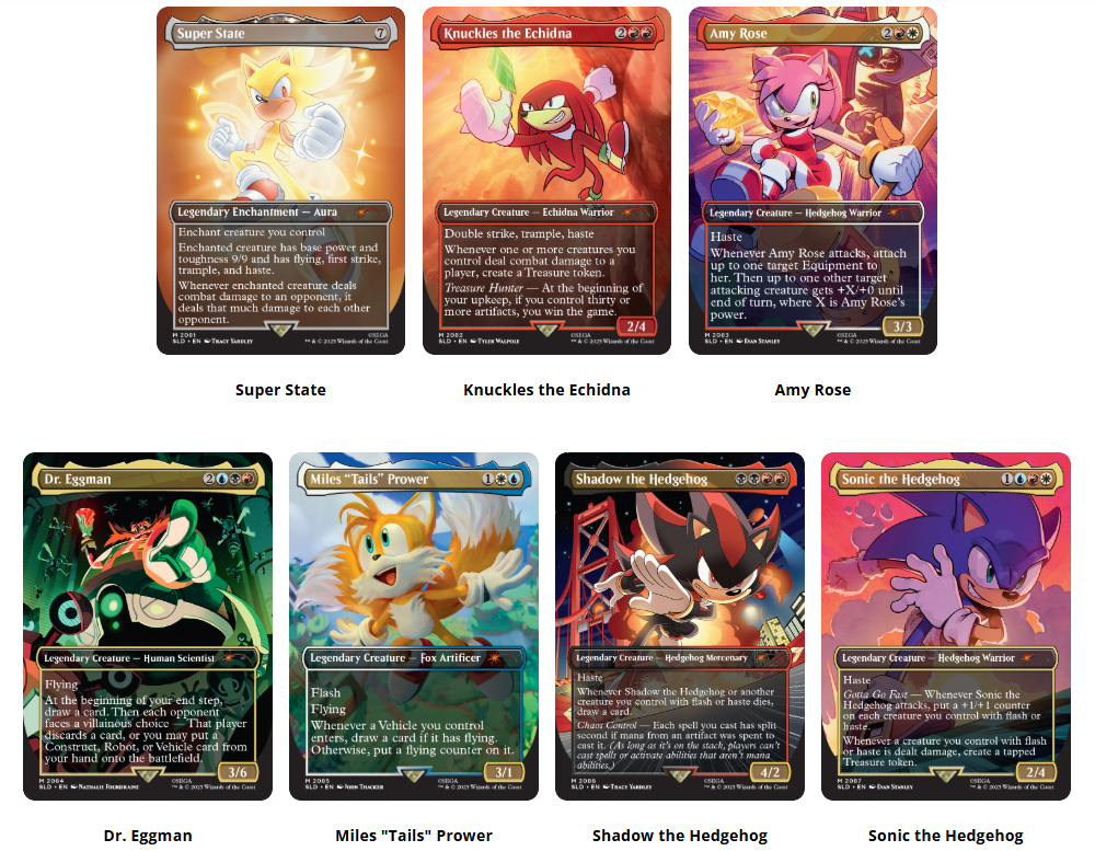 The Secret Lair x Sonic: Friends & Foes set features seven mechanically unique cards—each representing a fan-favorite character from the Sonic franchise. These cards are fully playable in Commander, Legacy, and Vintage formats and include: