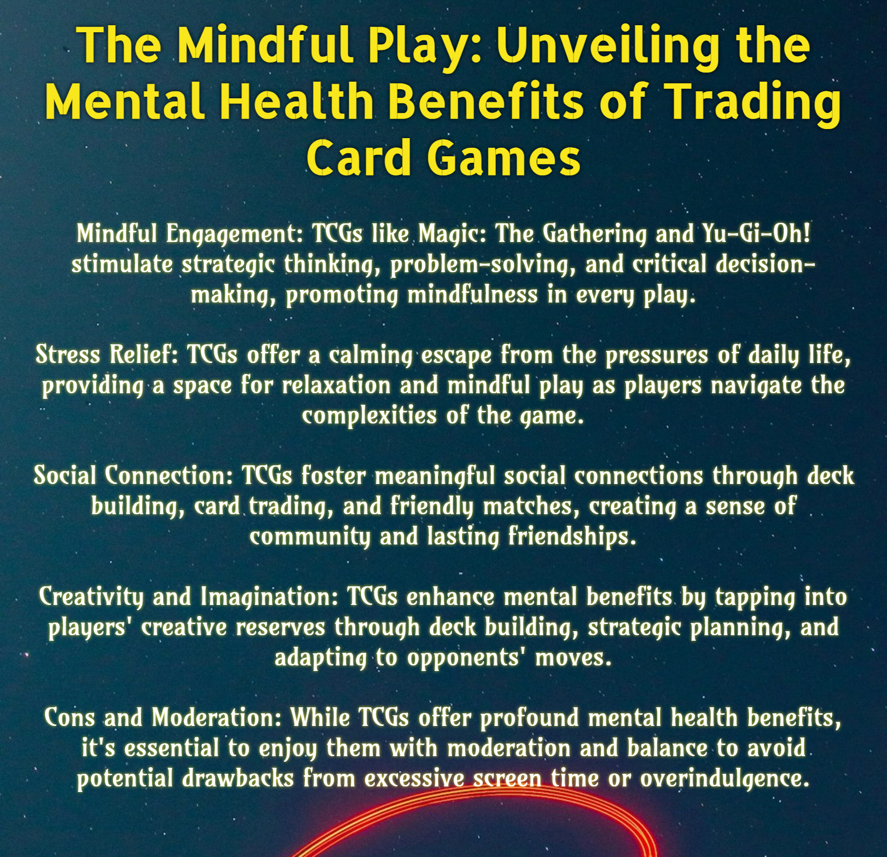 Players analyze game states, anticipate opponents' moves, and devise effective strategies. TCGs demand sharp problem-solving skills to overcome challenges and obstacles, promoting creativity and innovation. Critical decision-making is crucial, with every move impacting the game's outcome. Games like Magic: The Gathering and Yu Gi Oh are renowned for promoting strategic thinking. TCGs offer stress relief through immersive gameplay, social interaction, and the enjoyment of executing strategies, contributing to relaxation and mental well-being. In this exploration, we delve into the mindful play of TCGs and uncover the multitude of mental health benefits they bring.