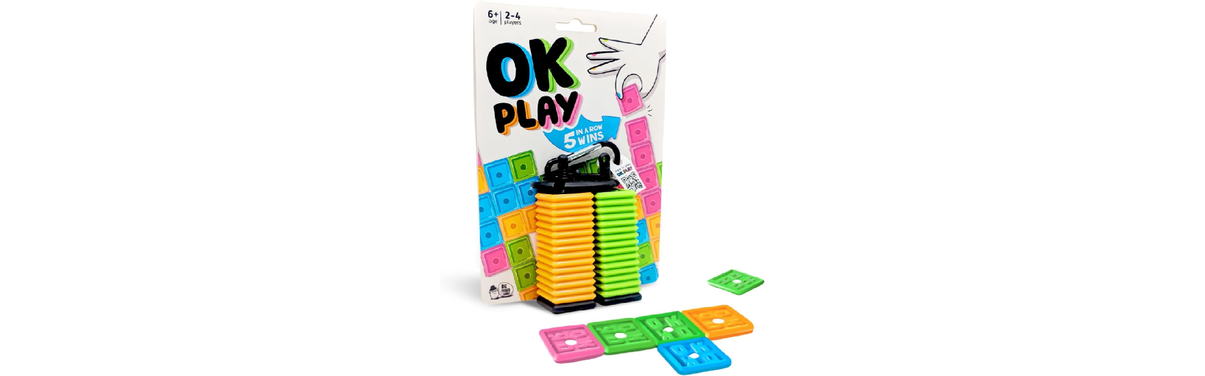 OK Play is a compact strategy game that combines simple rules with clever tactics. Instead of using a traditional board, players place colored tiles on any flat surface and attempt to form a line of five tiles in a row.