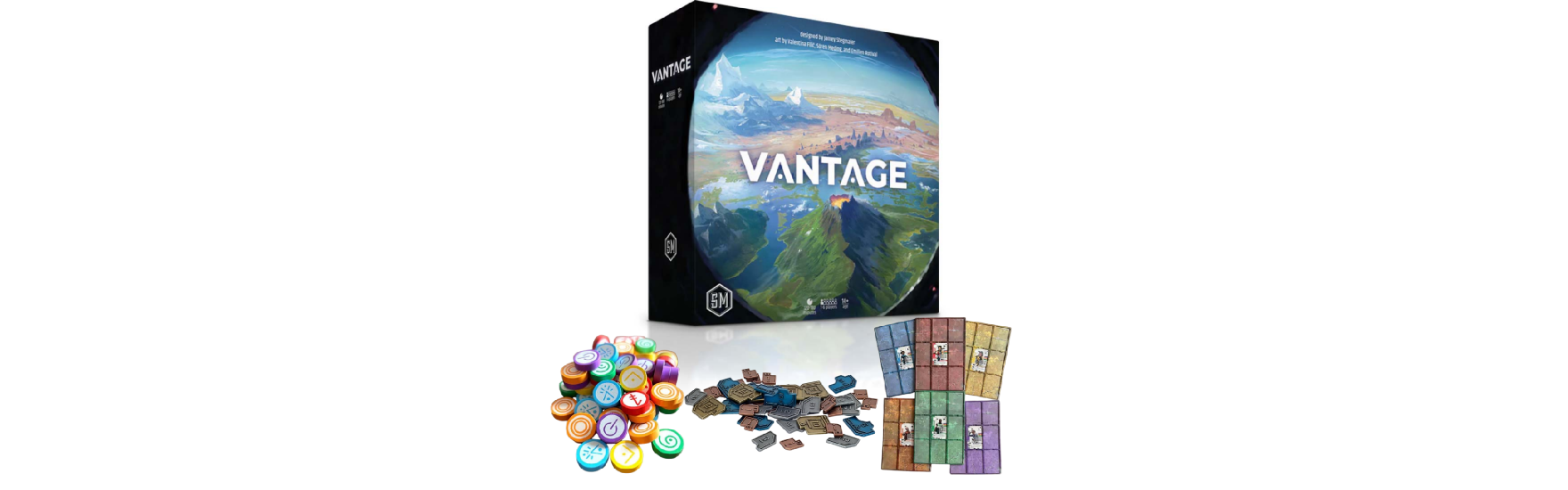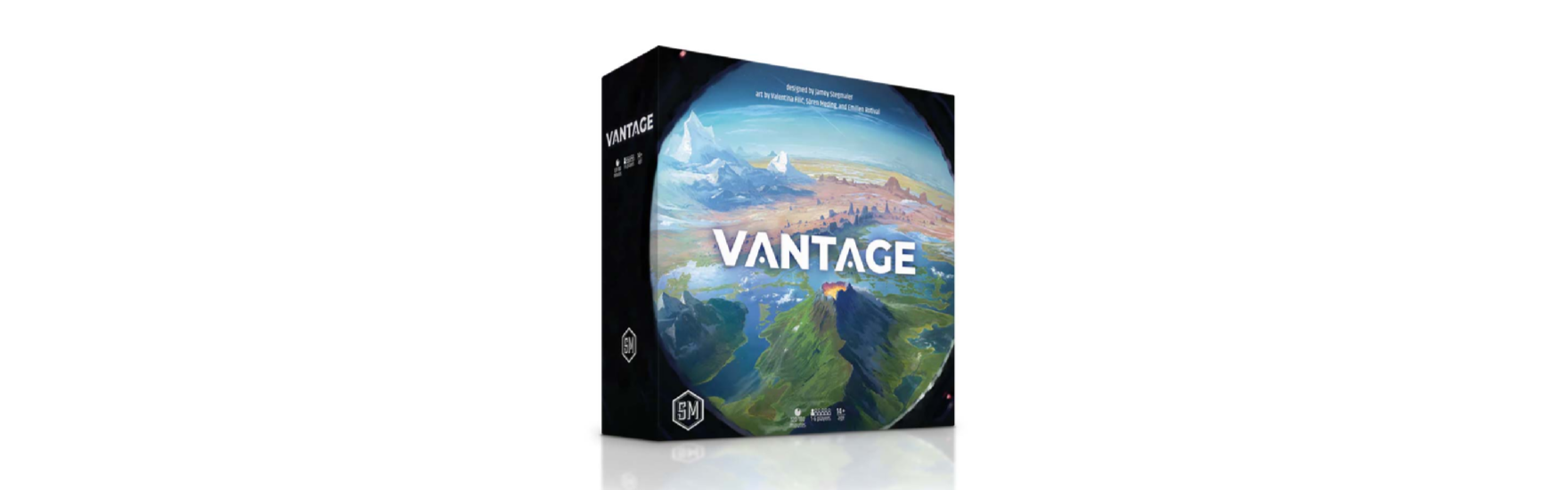 Vantage is a cooperative open-world narrative board game from Stonemaier Games, designed by Jamey Stegmaier and team. Players take on the role of crash survivors on an uncharted alien planet. From there, the goal is to explore, survive, and uncover the mysteries of the world—each from their own unique perspective.