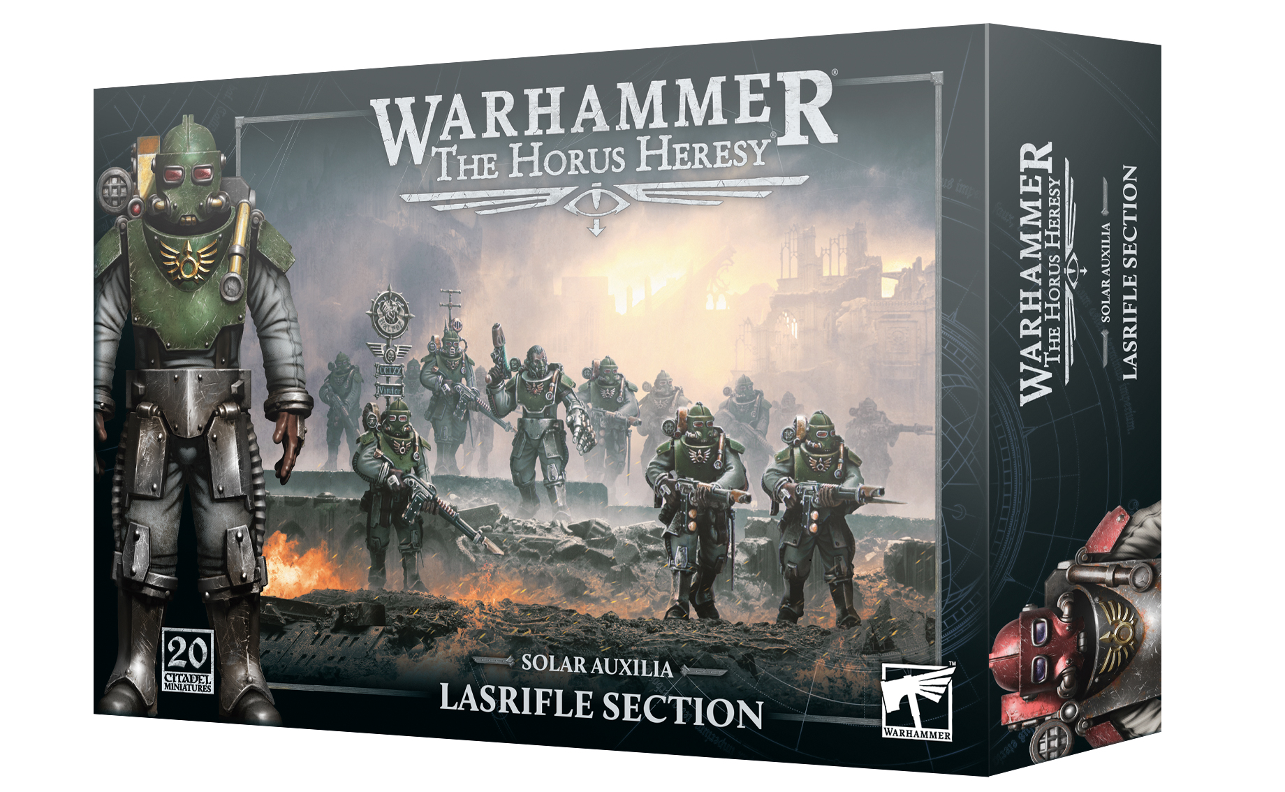 Solar Auxilia lasrifle sections can be consolidated into a larger unit of 20 soldiers if you desire larger formations. These troops, despite being regular, unaugmented humans, exhibit remarkable resilience due to their durable void armor.