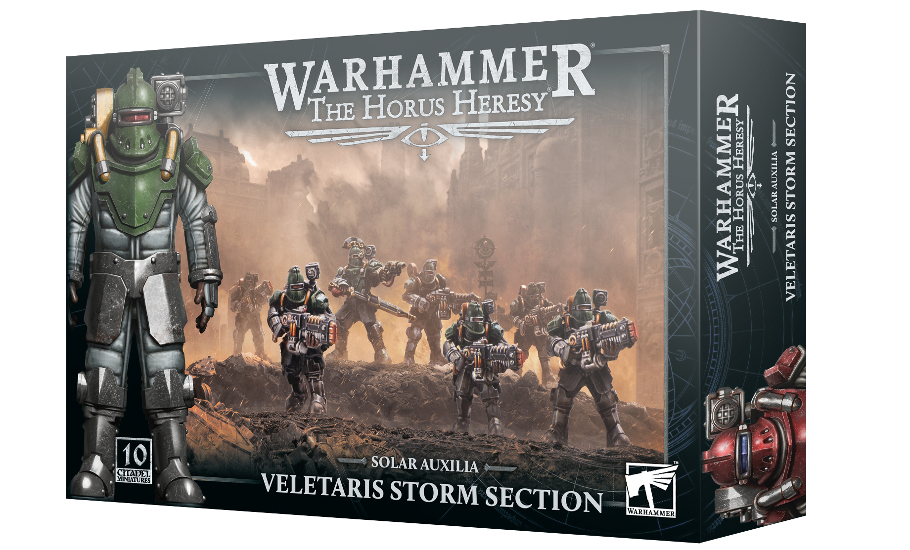 The Veletaris Storm Section unit comprises ten elite troopers equipped with void armor, granting them an added layer of protection in the fierce battles of the Horus Heresy. They can be armed with either volkite chargers or storm axes, and the package includes parts to construct one as a Sergeant, in addition to the choice of extra vexilla and vox trooper. These models are sold unpainted and unassembled.