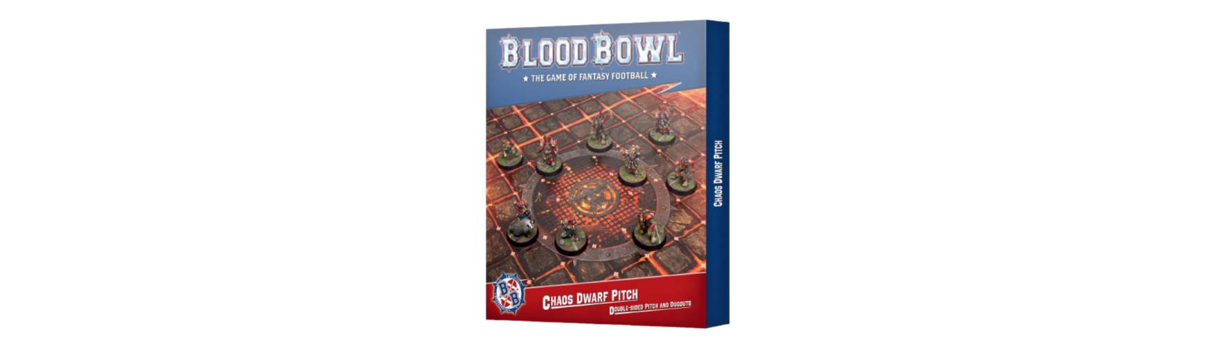 The Games Workshop Blood Bowl Chaos Dwarf Team Pitch and Dugouts Card Scenery 202-46 features a double-sided pitch that provides an impressive arena for your games, along with distinct dugouts to effectively manage your players.