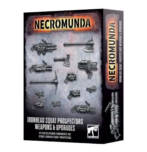 Ironhead Squat Prospectors Armaments and Modifications This assortment comprises two frames, offering two-handed power axes and picks, flamers, meltaguns, mining lasers, gem extractors, circular stone saws, and other items.