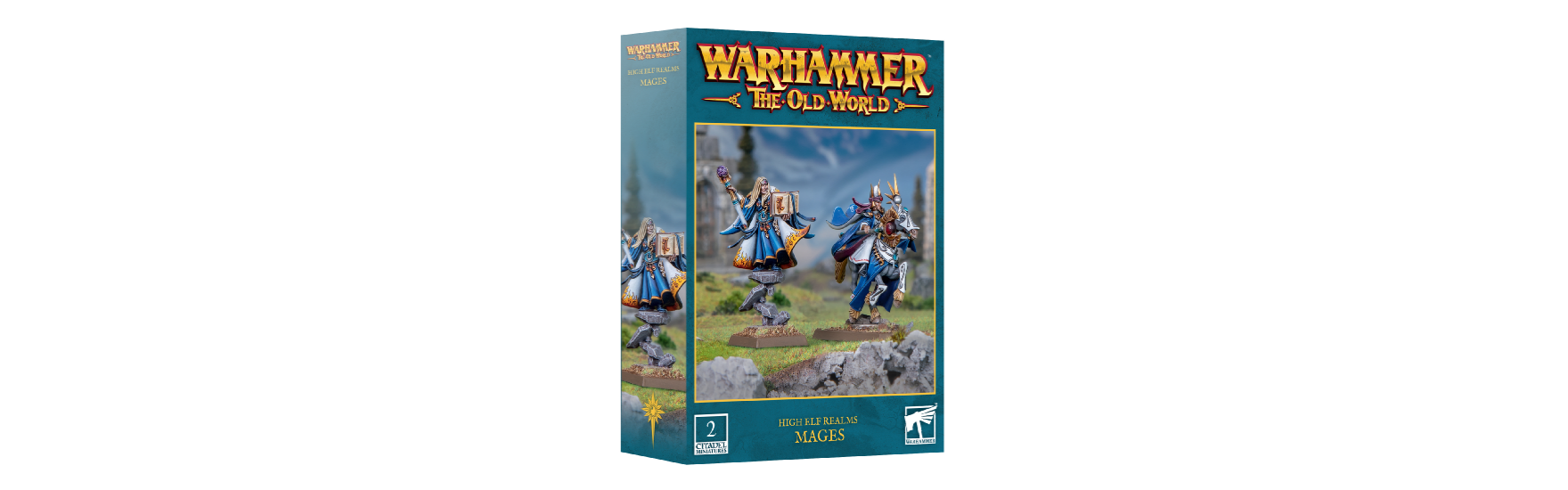 The Warhammer The Old World High Elf Realms Mages kit by Games Workshop enables you to build one High Elf Mage on foot and one on a barded elven steed. It features a variety of head and staff options, along with three base alternatives for the foot-mounted mage.