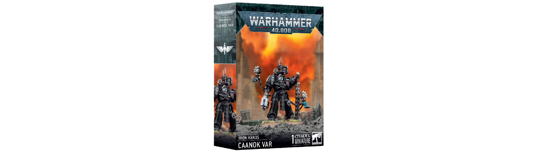 The Games Workshop Warhammer 40K Caanok Var Iron Hands Plastic Box 55-59 features a plastic miniature of Caanok Var wearing Terminator Armour, armed with his massive power maul, Axiom. It comes with a 50 mm round base. This model requires assembly and comes unpainted. It's combined well with Iron Hands dice.